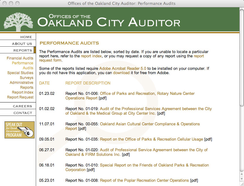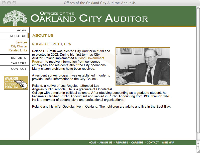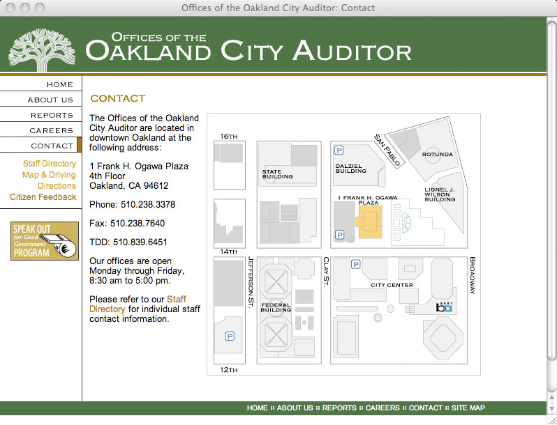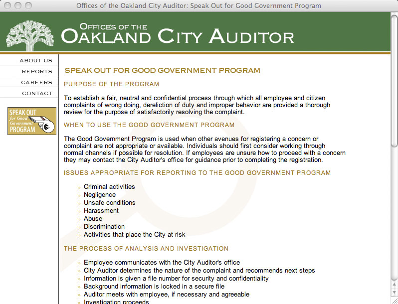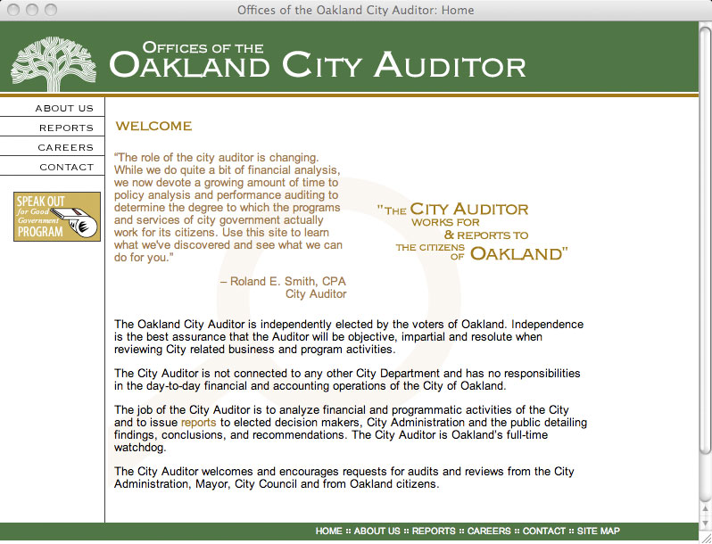 The Oakland City Auditor wanted to update its site to provide the citizens of Oakland with more extensive information about their offices and the services they provide. In addition, they wanted to promote their "Speak Out for Good Government" program.