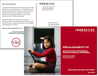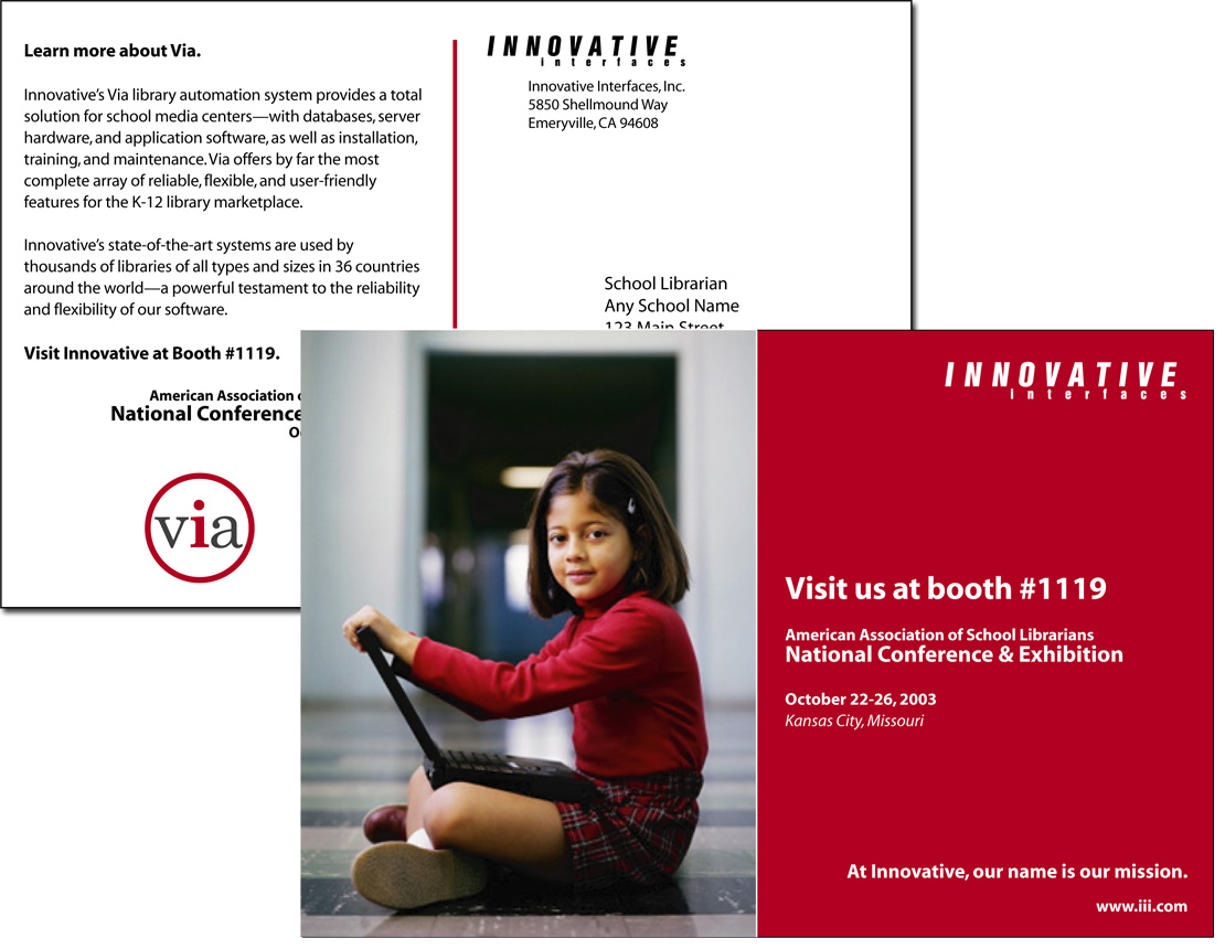 Innovative Interfaces developed a new library information product targeted toward k-12 school libraries. Worked with product development team to name the new product and design its logo. For its launch at the Association of School Libraries national conference, designed a postcard that was sent to thousands of prospective school libraries.